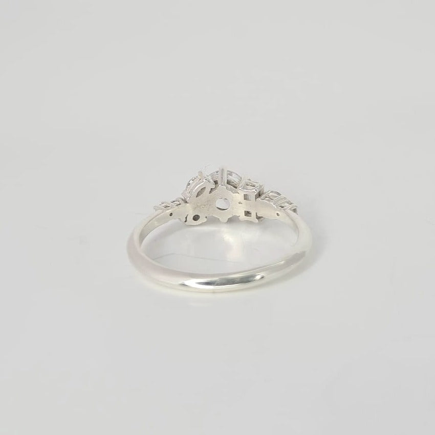 1.4mm wide smooth band set with a large cluster of various shapes of clear Moissanite.