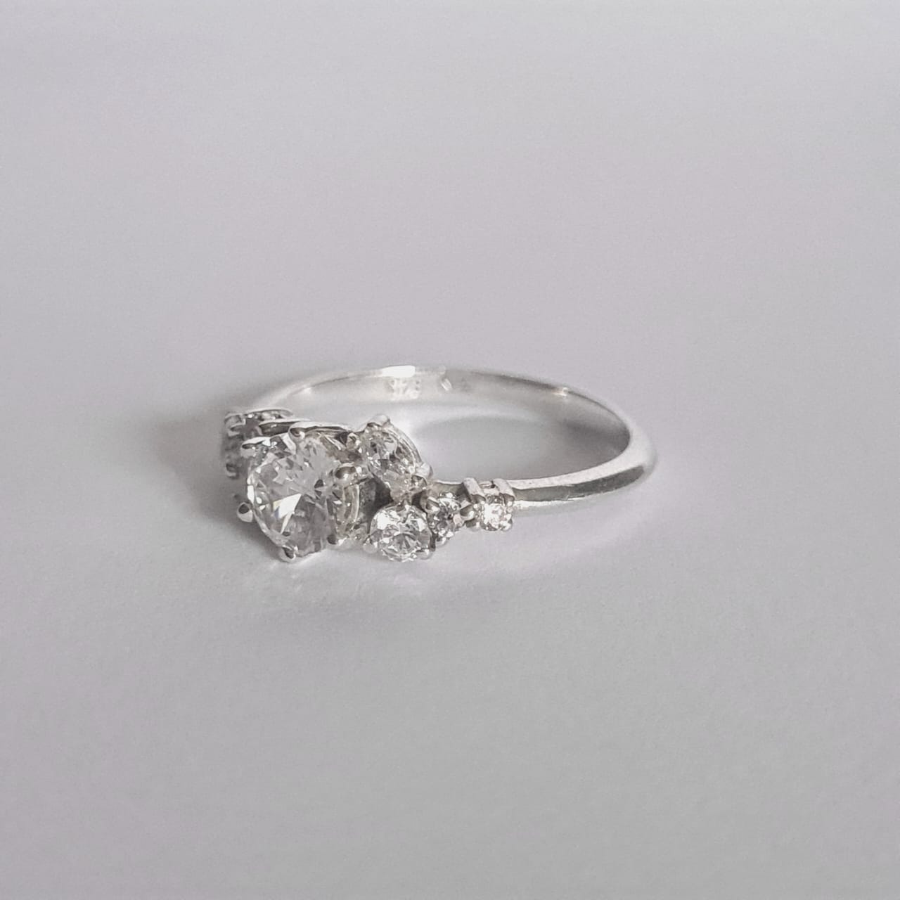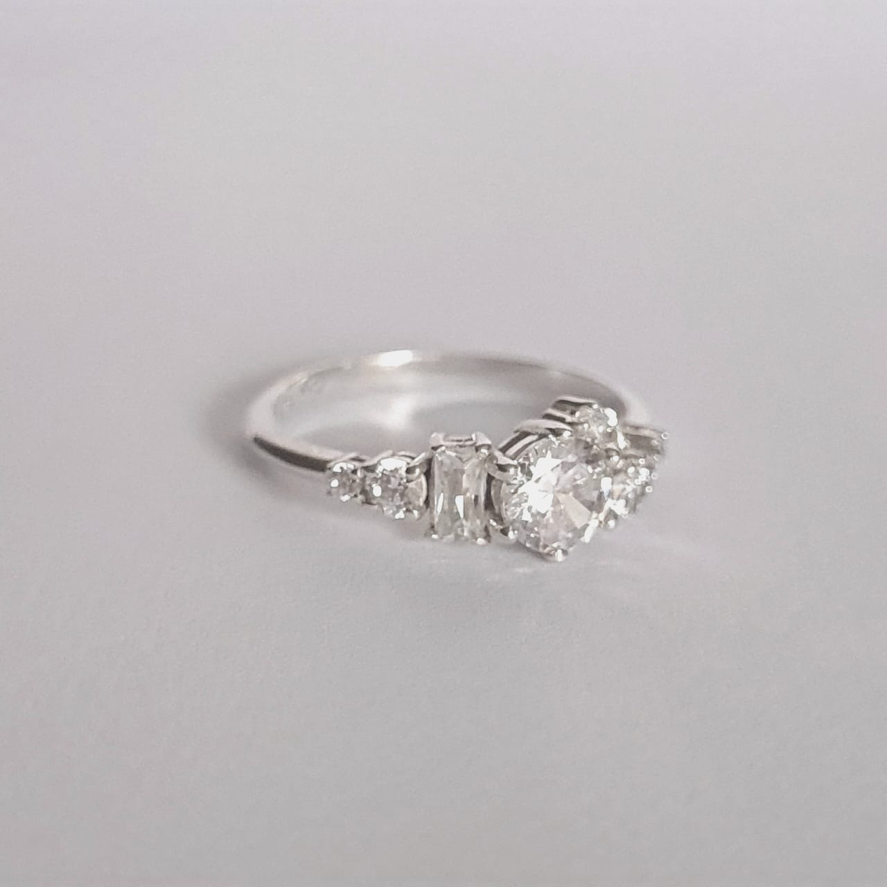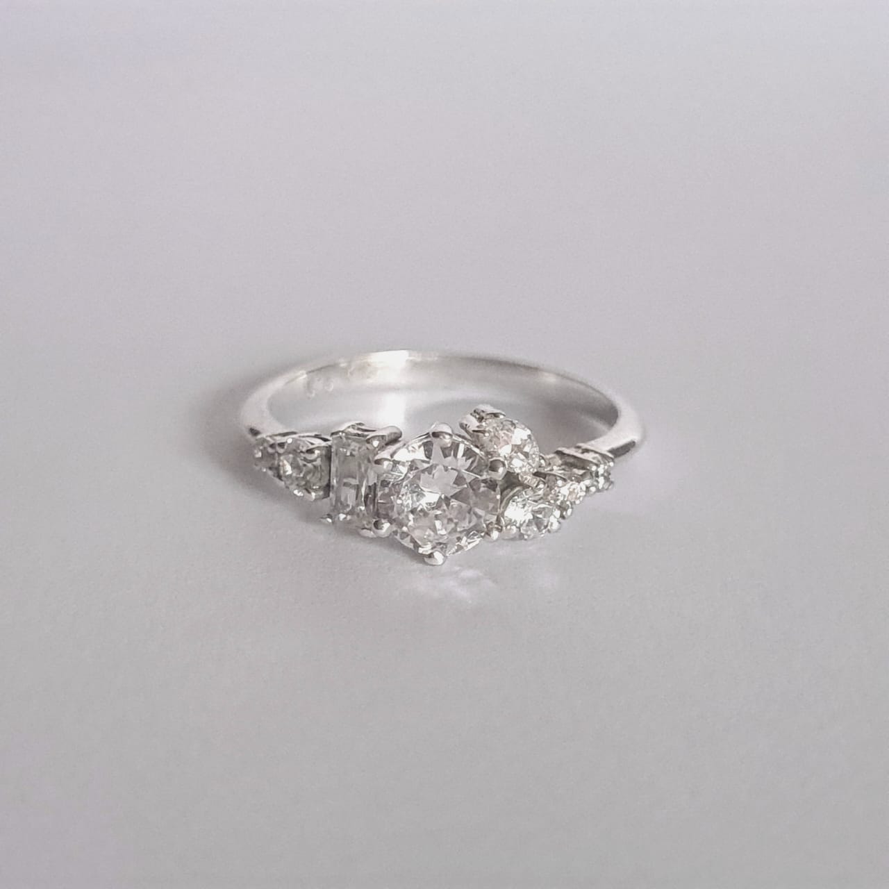 This ring contains 1 x brilliant cut 5mm + 1 x Marquise cut 3 x 2mm + 1 x Baguette cut 4 x 2mm + 2 x Brilliant cut 2,5mm + 3 x Brilliant cut 1.5mm.